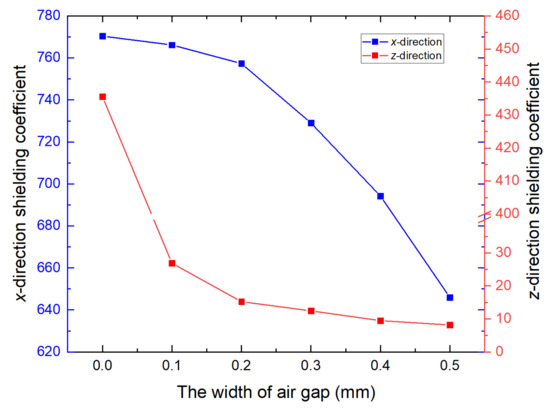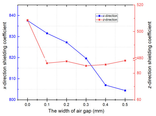 The relationship between mu-metal film thickness and magnetic shielding coefficient was investigated to quantify the inhibitory effect of FMCS structure on the air gap of the ferrite shield and to enhance the shielding coefficient. The conventional ferrite magnetic shielding coefficient variation with the gap width was first calculated. As shown in Figure 4, the x- and z-direction shielding coefficients decreased by 16.2% and 98.1%, respectively, when the gap width changed from 0 to 0.5 mm.