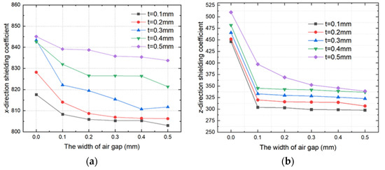 Relationship between the FMCS structure magnetic shielding coefficient and the gap width for different film thickness; (a) x-direction magnetic shielding coefficient, (b) z-direction magnetic shielding coefficient.