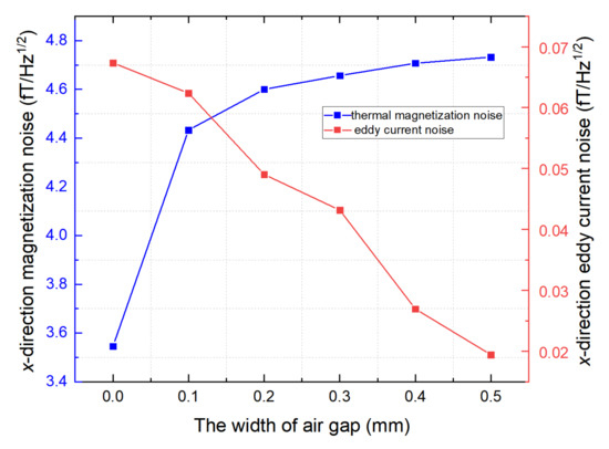 Magnetic noise is another important parameter for evaluating the shielding performance. Magnetic noise limits the enhancement of the sensitivity index, particularly in ultra-high-sensitivity magnetometers [26]. The sensitive axis of the magnetic field is generally oriented in the radial direction with an excellent magnetic shielding coefficient [2,4,27]. This study analyzed the influence of air gap on the shielding coefficient of conventional ferrite magnetic shields and FMCS structures. As shown in Figure 7, the air gap width increased from 0 to 0.5 mm, the thermal magnetization noise increased by 34.3%, and the eddy current noise decreased. However, the eddy current noise accounted for less than 1% of the total noise, which can be ignored.
