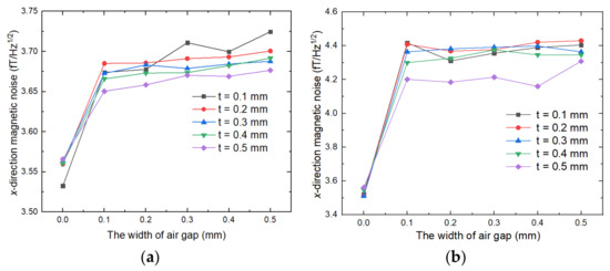 The magnetic noise calculation results of the FMCS structure are shown in Figure 8. As illustrated in Figure 8a, when mu-metal film was close to the ferrite magnetic shield, the FMCS structure demonstrated a noticeable effect on suppressing the air gap of the ferrite magnetic annuli. The magnetic noise increased by 4.5% when the air gap width was extended from 0 to 0.5 mm, but the magnetic noise did not increase with the increase of air gap width. When the air gap width was 0.5 mm and the film thickness was 0.1 mm, the magnetic noise of the FMCS structure was 21% less than that of the typical ferrite magnetic shield. The magnetic noise could be reduced further by increasing the film thickness. Figure 8b shows the magnetic noise of the FMCS structure when the ferrite shield and the film were adhered with double-sided tape and there was a gap between them. In this case, despite being able to maintain the air gap, the magnetic noise reduction was only 6.3% less than with standard ferrite magnetic shielding. Increasing the thickness of the film could also reduce the magnetic noise, but the effect was minimal.
