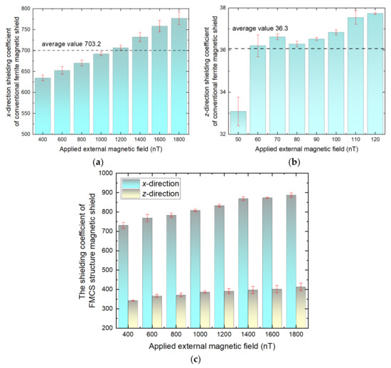 The (a) x-direction and (b) z-direction shielding coefficient of conventional ferrite magnetic shield versus applied external magnetic field; (c) Shielding coefficient of the FMCS when the external magnetic field is applied.
