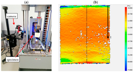 Measurement using the DIC method: (a) research stand and (b) exemplary results of longitudinal deformations.