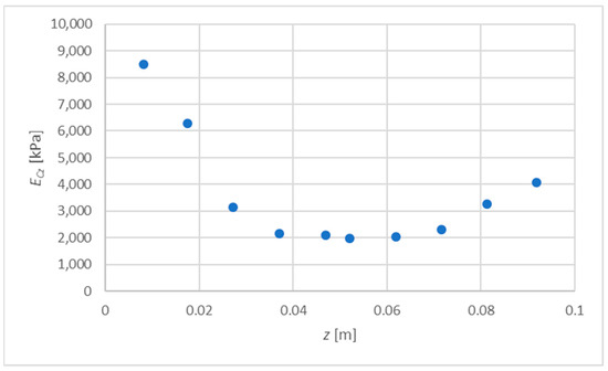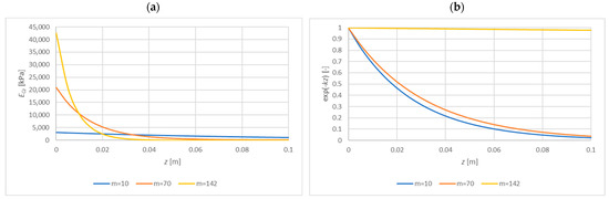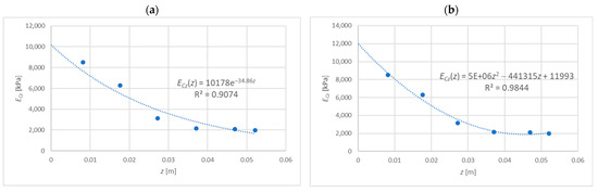 The distribution of the elasticity modulus presented in Figure 2 is considered, which will be described with the exponential function or the polynomial of degree 2. A certain disadvantage of the exponential function is that it correctly reflects the variability of material parameters only when the values disappear along with the variable . For this reason, for the determination of and , only data for six points (up to a depth of m) were taken into account; see Table 1, Figure 4.
