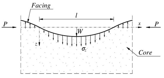 Linear constitutive relationships were assumed for the facing and core materials. It was also assumed that the properties of the core change continuously along its thickness. In general, the modulus of elasticity (in the direction perpendicular to the facing) is independent of the shear modulus . As in [2,12]. Core deformations in the longitudinal direction (along the -direction) were not included in the energy equilibrium equation. In other words, any vertical lines indicated before deformation remain vertical during wrinkling. The justification for this approach can be found, inter alia, in [24].
