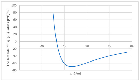 From Figure 4b, the following function parameters can be read: kN/m4, kN/m3, kN/m2, which means kN/m4, kN/m2 and kN/m2. For these parameters, a quantity is sought which will satisfy the condition (23). The values of the left side of Equation (23) presented as a function of the variable are shown in Figure 5.