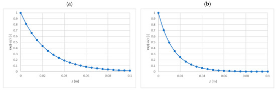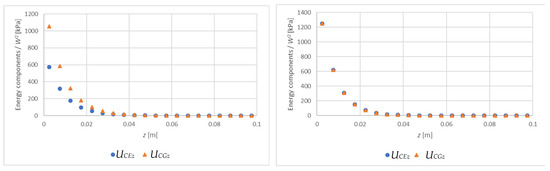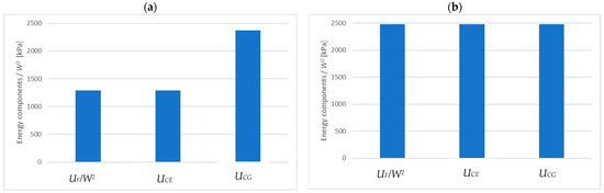 In order to trace the relationship between the energies expressed in (4) and (5), we consider two cases: the exponential function from the example above ( kPa and [1/m]) and the constant function ( kPa and [1/m]). For these two cases, Figure 6 shows the components (divided by ), determined for the successive layers of the core with a thickness of 0.005 m ():