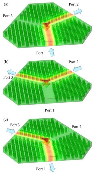Figure 5. (a) The power distribution in the PhC circulator at 26.35 GHz when signal incident from Port 1; (b) signal incident from Port 2; (c) signal incident from Port 3.