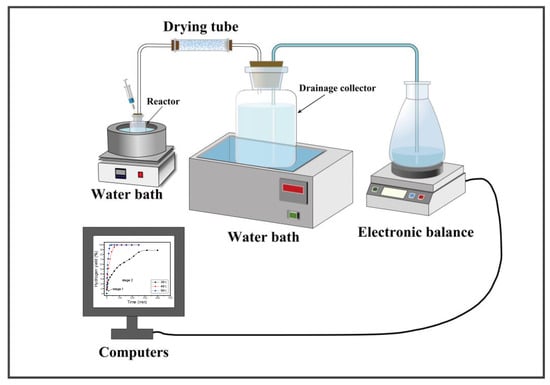 The hydrogen production performance of the composite powders was determined by the drainage method []. A schematic diagram of the hydrogen production measurement device is shown in Figure 1. A 125 mL flask reactor containing 0.3 g alloy composite powder was placed in a water bath and continuously stirred. After the temperature (30 °C, 40 °C, 50 °C) was stable, 10 mL preheated reaction medium, such as distilled water, was injected into the reactor (preheated until the temperature was stably consistent with the reaction temperature). The hydrogen produced by alloy composite powder hydrolysis was purified through a drying tube to remove moisture. The actual hydrogen production was obtained indirectly by measuring the weight of the replaced water, and the hydrogen conversion efficiency of the material was the ratio of the actual hydrogen production to the theoretical value.