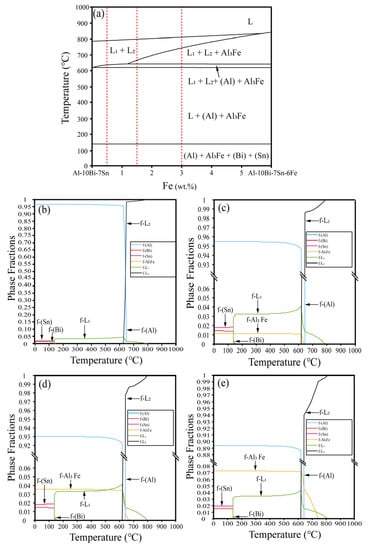 (a) Calculated vertical section diagram of Al-10Bi-7Sn-(0~6)Fe (wt.%) quasi-binary system and the phase fractions during solidification in (b) Al-10Bi-7Sn (wt.%) []; (c) Al-10Bi-7Sn-0.5Fe (wt.%); (d) Al-10Bi-7Sn-1.5Fe (wt.%); (e) Al-10Bi-7Sn-3Fe (wt.%).
