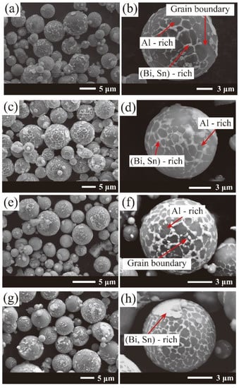 SEM images of the as-atomized Al-10Bi-7Sn-xFe (x = 0, 0.5, 1.5, 3) (wt.%) composite powders: (a,b) Al-10Bi-7Sn (wt.%) []; (c,d) Al-10Bi-7Sn-0.5Fe (wt.%); (e,f) Al-10Bi-7Sn-1.5Fe (wt.%); (g,h) Al-10Bi-7Sn-3Fe (wt.%).
