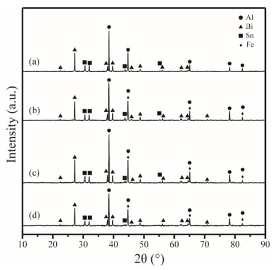 XRD patterns of the prepared composite powders: (a) Al-10Bi-7Sn (wt.%) []; (b) Al-10Bi-7Sn-0.5Fe (wt.%); (c) Al-10Bi-7Sn-1.5Fe (wt.%); (d) Al-10Bi-7Sn-3Fe (wt.%).