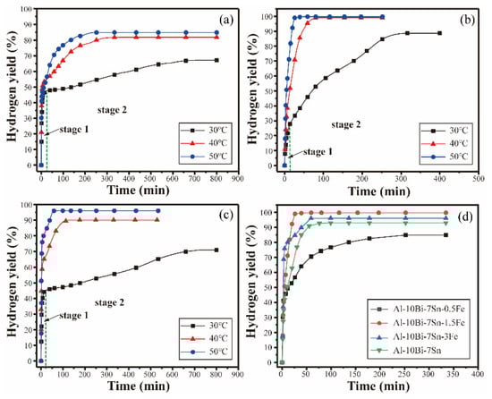 The hydrogen generation properties of the composite powders while reacting with distilled water at different temperatures (30 °C, 40 °C, and 50 °C) were investigated, and the results are shown in Figure 6. As shown in Figure 6, the Al-10Bi-7Sn-xFe (x = 0, 0.5, 1.5, 3) (wt.%) composite powders exhibited superior hydrolysis characteristics, and the process could be divided into two stages. The initial stage (stage 1) was a fast-growing stage, and the conversion rate increased rapidly. Then, the next step was a dormant period (stage 2), which was a slowly growing phase with a long duration. As shown in Figure 6a, the initial stage of the reaction was a rapid hydrogen generation stage; the hydrogen yield increased rapidly to 47% within 50 min. Subsequently, the hydrolysis process entered stage 2; the hydrogen yield reached 66.8% at 650 min. Higher temperatures promoted the reactions; the reactions achieved higher conversion yields in smaller amounts of time. As the reaction temperature rose, there were still two reaction stages in the hydrolysis process of the Al-10Bi-7Sn-0.5Fe, Al-10Bi-7Sn-1.5Fe, and Al-10Bi-7Sn-3Fe (wt.%) composite powders at 40 °C and 50 °C. Notably, stage 2 was shortened, whereas stage 1increased correspondingly. The composite powders produced hydrogen rapidly at the instant of contact with water until the reaction stopped, which could complete all the reaction stages in a short time, and the final hydrogen yield was close to 100%.