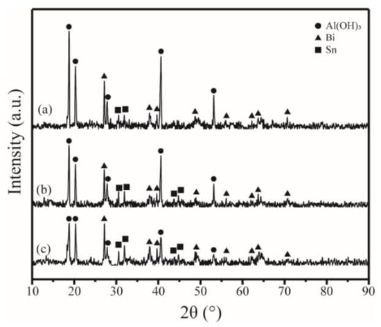XRD patterns of composite powders after hydrogen generation: (a) Al-10Bi-7Sn-0.5Fe (wt.%); (b) Al-10Bi-7Sn-1.5Fe (wt.%); (c) Al-10Bi-7Sn-3Fe (wt.%).