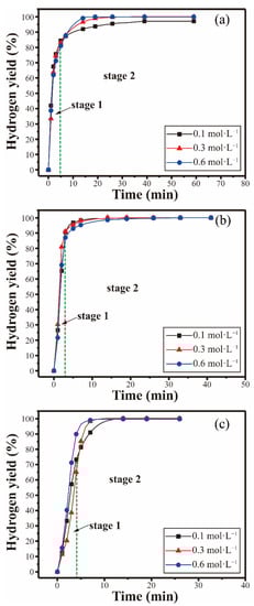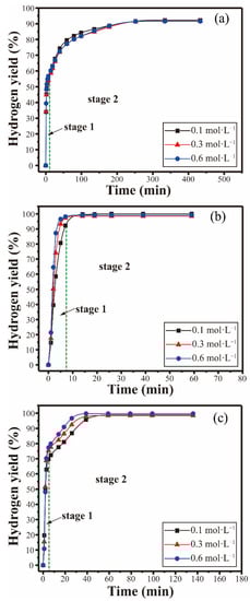 Hydrogen generation curves of the Al-Bi-Sn-Fe composite powders reacting with CaCl2 solutions of different concentrations at 50 °C: (a) Al-10Bi-7Sn-0.5Fe (wt.%); (b) Al-10Bi-7Sn-1.5Fe (wt.%); (c) Al-10Bi-7Sn-3Fe (wt.%).