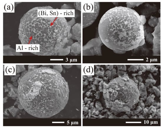 Surface morphologies of the Al-10Bi-7Sn-xFe (x = 0, 1.5) (wt.%) composite powders exposed to air for different times (25 °C and 60 RH%): (a) Al-10Bi-7Sn-1.5Fe (wt.%), 12 h; (b) Al-10Bi-7Sn-1.5Fe (wt.%), 24 h; (c) Al-10Bi-7Sn-1.5Fe (wt.%), 72 h; (d) Al-10Bi-7Sn (wt.%), 12 h [].