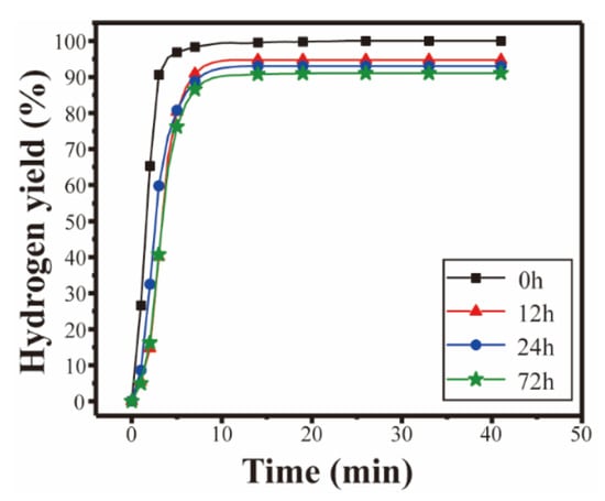 The hydrogen generation properties of the composite powders after storing for different hours while reacting with CaCl2 solution were investigated, and the results are shown in Figure 11. As shown in Figure 11, after 12 h of exposure, the hydrogen yield of the Al-10Bi-7Sn-1.5Fe (wt.%) powders was 94.7% when they reacted with 0.1 mol·L−1 CaCl2 solution, which was 5% lower than that of the powders not exposed to air. With exposure time prolonged to 24 and 72 h, the hydrogen yield decreased to 93% and 91%. These results suggested that the hydrogen generation properties of the Al-10Bi-7Sn-1.5Fe (wt.%) composite powders included excellent anti-oxidation properties. This is mainly because the surface, with less small cracking in the Al-10Bi-7Sn-1.5Fe (wt.%) powders, effectively isolates the air moisture and prevents the water vapor from penetrating into the powder. Furthermore, when the Al-10Bi-7Sn-1.5Fe (wt.%) powders reacted with CaCl2 solution, the Cl- in the solution could easily penetrate the oxide layer on the surface of the powders [], then making contact with the fresh internal Al, building the Al-Al3Fe micro galvanic cell, thus promoting the rapid hydrolysis of the Al-10Bi-7Sn-1.5Fe (wt.%) powders to generate hydrogen. The addition of Fe to aluminum-based hydrogen production materials will become very promising in terms of the activity retention of Al-Bi-Sn composite powders exposed to air.