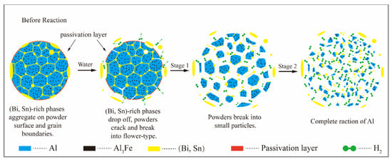 Schematic illustration of the reaction mechanisms of the Al-10Bi-7Sn-xFe (x = 0.5, 1.5, 3) (wt.%) composite powders reacting with distilled water at 30 °C.