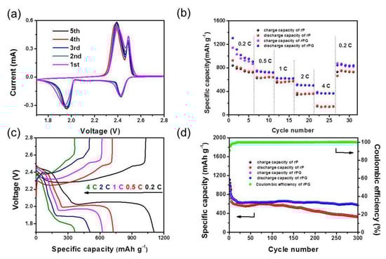 The electrochemical properties of the rPG in Li-S batteries were also evaluated. The CV curve of rPG/S was first tested with CR2032 coin cells between 1.7 V and 2.8 V for the first five cycles (Figure 5a). During the discharge process, rPG/S presented a pair of reduction peaks around 2.4 V and 1.96 V, corresponding to the transformation procedure from S8 to long-chain polysulfides Li2Sx (x = 4–8) and Li2S4 to short-chain polysulfides (solid Li2S2/Li2S), respectively. Significantly, the curves in the subsequent five scans were observed in almost the same shape, and the peak positions are extremely close to each other, indicating the excellent cycling stability of the rPG/S cathode in Li-S batteries. Meanwhile, the rPG/S showed excellent rate capability (Figure 5b) at various rates (i.e., 0.2 C, 0.5 C, 1 C, 2 C, 4 C and 0.2 C). Even at 4 C, the composite can still maintain a capacity as high as ~370 mAh g−1. When the rate returns back to 0.2 C, the capacity can still recover to ~840 mAh g−1. In contrast, rP/S can only deliver ~135 mAh g−1 at 4 C and ~730 mAh g−1 back to 0.2 C. Figure 5c represents the typical charge/discharge profiles of rPG/S at various current densities from 0.2 to 4 C in the potential range of 1.7–2.8 V, in which the potential hysteresis between discharge and charge profiles for rPG/S cathode is not obvious even at 2 C, indicating the excellent electrochemical kinetics of sulfur encapsulated in the elaborately designed rPG host. The cycling performance of rPG/S and rP/S were also evaluated at 1 C, as shown in Figure 5d. The rPG/S electrode shows an initial discharge specific capacity of ~1100 mAhg−1 and maintains 580 mAh g−1 when it comes to the 300th cycle (a decay of 0.09% per cycle based on the fourth cycle). In contrast, although the rP/S delivers an equivalent initial discharge specific capacity of ~1100 mAh g−1, a severe decline in specific capacity can be observed. After testing for 300 cycles, the coulombic efficiency of rPG/S can still be as high as 99%. Furthermore, the typical charge and discharge profiles of rPG/S within a voltage window ranging from 1.7 to 2.8 V are exhibited in Figure S6, which is in good accordance with the result of the CV curves and cycling performance. The good cycling performance and excellent rate capability can be ascribed to the rational design of the rPG material, which can be further illuminated as follows: (i) the ideal compatibility between the PBC and graphene phase interface endows an excellent mass transfer path; (ii) the three-dimensional sandwiches provide a proper host for polysulfides; (iii) the porous structure of the sandwich improves the cycling stability; (iv) the polar functional groups in the multilayered composites improve the overall performance of the Li-S batteries.
