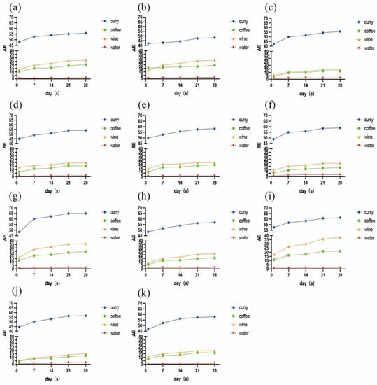 Color changes over time of 11 composite resins immersed in curry, coffee, wine, and distilled water for 1, 7, 14, 21, and 28 days: (a) B2; (b) F03; (c) CXU; (d) CS; (e) CD; (f) DF; (g) DXU; (h) Z250; (i) Z350; (j) MP; and (k) TNC.
