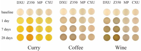 As for the resin samples, Z350 and DXU performed intensive susceptibility to staining from seven days of immersion. After 28 days, DXU underwent the strongest discoloration in curry (∆E5 = 65.05) and coffee (∆E5 = 24.97), followed by Z350 (∆E5 = 61.22 in curry, ∆E5 = 21.19 in coffee). Z350 was the most susceptible to wine (∆E5 = 37.76), followed by DXU (∆E5 = 36.32). B2 (∆E5 = 20.32 in coffee, ∆E5 = 26.63 in wine) and F03 (∆E5 = 19.55 in coffee, ∆E5 = 26.41 in wine) were also intensively stained by coffee and wine, but were rather resistant to discoloration in curry. F03 showed significant resistance to discoloration in curry (∆E5 = 48.22) compared with the other materials (p < 0.05) and presented the lowest ∆E values at all immersion times. CXU underwent the third lowest color change in curry (∆E5 = 55.76), and the lowest in coffee (∆E5 = 11.91) and wine (∆E5 = 13.52). MP performed similar staining resistance to CXU in these solutions, although it differed significantly (p < 0.05) from CXU when stained by wine. CD, CS, TNC, DF, and Z250 exhibited intermediate capacities to avoid discoloration. In particular, CS was associated with greater staining resistance (∆E5 = 54.12) in curry than the other materials, with the exception of F03. DF remained rather stable in coffee (∆E5 = 12.85) and wine (∆E5 = 19.06). Z250 had lower ∆E5 values than CD and TNC in curry and coffee, and higher ∆E5 values in wine, but the differences between them were not statistically significant (p > 0.05). Figure 2 illustrates the staining situations of four representative material samples in each staining solution.