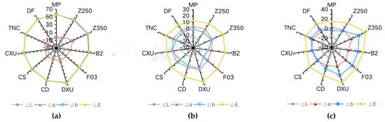 Radar graphs demonstrating CIE L*, a*, and b* value changes after immersion in colorants for 28 days: (a) curry (b) coffee (c) wine.