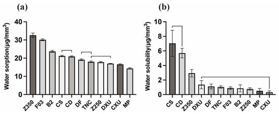 Water sorption also plays a crucial role in the clinical success of dental materials. Ideally, resin composites should be highly stable and impermeable to water, but the polymer network can absorb moisture, which can add several percentages to the material’s total weight []. The absorption of water has many negative effects on restorative materials, such as color change, impairing of the mechanical properties, decreasing of the wear-resistance, hydrolyzing and degrading of chemical bonds at the resin–filler interface [,]. In addition, water absorption produces the external movement of residual monomers and ions, consequently increasing the solubility of resin composites, which can degrade the biocompatibility of materials, reduce their volume, weaken their mechanical properties, and lead to discoloration by chemically degrading the filler–resin bond of the resin matrix [,].