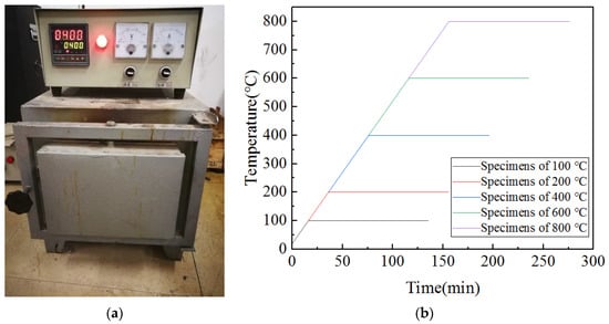 The concrete was made into a cube specimen of 150 mm × 150 mm × 150 mm and cured in a standard curing room for 28 days after demolding. Before the mechanical properties were tested, a resistive heating furnace (model: KSY-12-T), produced by Changsha Changcheng Electric Furnace Factory, was used to heat the concrete specimens [29], as shown in Figure 1. During heating, all specimens were heated to a predetermined high temperature (100 °C, 200 °C, 400 °C, 600 °C, or 800 °C) in the heating furnace at a rate of 5 °C/min, and then the temperature was maintained for 2 h to make sure the specimens were heated evenly. Next, the high-temperature specimens were cooled by air cooling, that is, the specimens were placed in a room-temperature environment until the temperature dropped to room temperature. During the heating process, the thermometer reading inside the heating furnace was read and recorded every 60 s, and the temperature change of the specimen during the heating process was obtained as shown in Figure 1b. Finally, the mechanical properties such as uniaxial compressive strength and shear strength were tested.