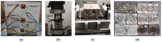 Compressive strength and shear strength are important indicators to measure the mechanical properties of concrete, which are greatly affected by temperature. In order to study the influence on the mechanical properties of concrete after exposure to high temperatures, uniaxial compressive and shear tests were carried out on the heated specimens at 20 °C, 100 °C, 200 °C, 400 °C, 600 °C, and 800 °C. The compression test used a uniaxial compression form; the location of strain gauges is shown in Figure 2a, and the location of the LVDT is shown in Figure 2b. The shear test adopted a direct shear form, as shown in Figure 2c, and the instrument was equipped with an LVDT. The shear test measured the peak shear force of a concrete specimen, which was then divided by the shear area to obtain the shear strength. In addition, in the uniaxial compression test and shear test, the force control mode was used, and the loading rate was 0.5 kN/s. On the tested concrete specimens, L represents low-strength concrete, and the number represents the temperature that concrete was subjected to during the test. For example, L600 expresses the low-strength concrete that was heated to 600 °C. In the tests for this paper, there were two types of concrete specimens for each temperature (20 °C, 100 °C, 200 °C, 400 °C, 600 °C, and 800 °C), one of which was used for the uniaxial compression test and one for the shear test, as shown in Figure 2d.
