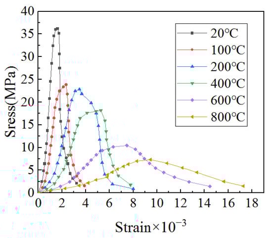 In order to obtain a more accurate stress–strain curve, during the experiment the instrument could automatically record the force and displacement, and then divide the force by the loading area to obtain the stress and divide the displacement by the height to obtain the strain. The converted curve is the stress–strain curve, and the stress–strain curves of concrete specimens after different heated temperatures are shown in Figure 3. In addition, the peak stress and peak strain of specimens are shown in Table 2. It can be seen from Figure 3 and Table 2 that with the increase in temperature, the shape of the curve transitions from sharp to flat, indicating that the stress of the concrete gradually decreases while the strain gradually increases, resulting in damage inside the specimen, and high temperature will cause great damage to concrete.