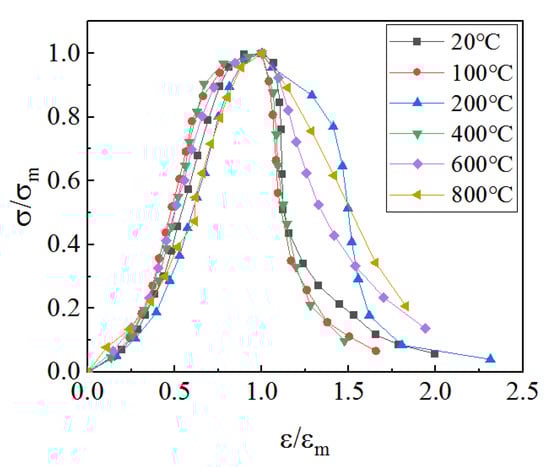In this paper, the stress–strain curves after different heated temperatures were normalized without dimensionality [30], that is, the strain on the abscissa was divided by the peak strain, the stress on the ordinate was divided by the peak stress, and then the full stress–strain curve was drawn as shown in Figure 4. It can be seen from Figure 4 that the full stress–strain curves after different heated temperatures basically overlap in the ascending segment before ε/εm equals 1, while the descending segment after ε/εm equals 1 has greater discreteness and has varying degrees of smoothness.