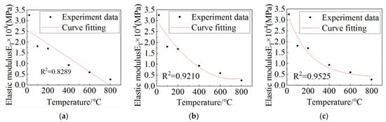 At the same time, in order to quantitatively describe the relationship between elastic modulus and temperature, on the basis of obtaining the full stress–strain curve, stress and the corresponding strain at the ordinate of 0.4 on the full stress–strain curve were taken. Finally, the elastic modulus of the concrete specimens after different heated temperatures were obtained by dividing the strain by the stress obtained through the above method [31], as shown in Table 3. Linear, polynomial, and exponential fitting methods were used to fit the relationship between the elastic modulus and the temperature, and the results are shown in Figure 5. It can be seen that the elastic modulus of the concrete decreases exponentially after high-temperature heating and cooling. During fitting, the larger the R-square was, the higher the fitting accuracy was. By comparing and analyzing the R-square of various fitting methods, it can be concluded that the exponential fitting result is more accurate, and the fitting formula is shown as follows: