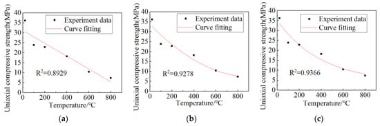 Fitting curve of the relationship between uniaxial compressive strength and temperature: (a) linear fitting; (b) polynomial fitting; (c) exponential fitting.