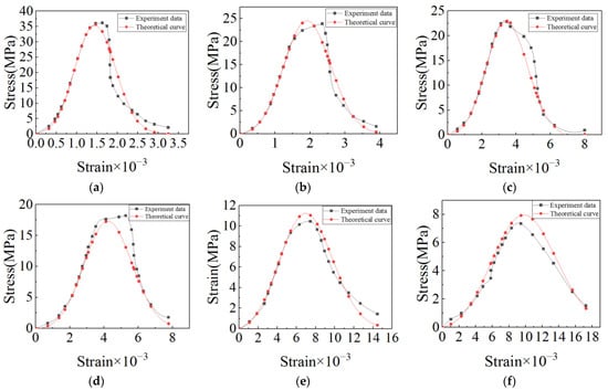 Figure 7 shows the test results and the theoretical results from the high-temperature damage constitutive equation for concrete. It can be seen that the test data are close to the theoretical data. In the process of fitting by MATLAB, when the temperatures are 20 °C, 100 °C, 200 °C, 400 °C, 600 °C, and 800 °C, its R-square reaches 0.9851, 0.9930, 0.9914, 0.9945, 0.9955, and 0.9862 respectively. To sum up, the theoretical data calculated from the high-temperature damage constitutive equation is very close to the test data, which means the high-temperature damage constitutive equation can be used for reference in subsequent analysis.