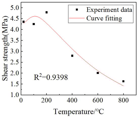 In addition, in order to express the relationship between shear strength and the temperature of the concrete, MATLAB was used to fit the data. The fitting Formula (16) was obtained, and the fitting results are shown in Figure 8.