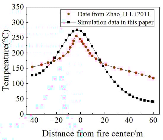 The temperature cloud of the tunnel vault along the longitudinal direction is shown in Figure 10, and the comparison of the temperature range of the tunnel vault along the longitudinal direction between the reference [38] and the model in this paper is shown in Figure 11. It can be seen from Figure 11 that the temperature distribution of the tunnel vault along the longitudinal direction in the model was similar to the result from the reference [38]. Moreover, the temperature was the highest in the burning compartment, and the temperature near the two ends of the tunnel hole was lower. As for the specific value of the tunnel vault temperature, the maximum temperature value simulated in this paper and in the reference [38] was 275.54 °C and 255.58 °C, respectively, both of which are similar, so the correctness of the model in this paper is verified.