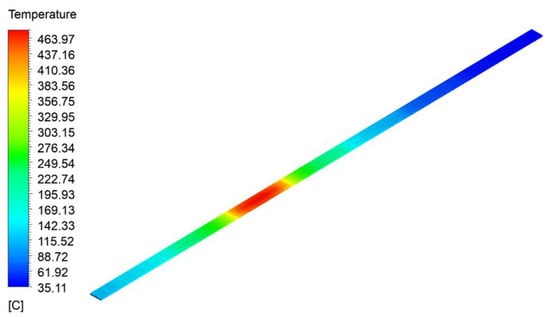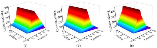 In addition, the overall temperature field of the cast-in-place C35 concrete track bed was symmetrical with respect to the X axis (width) of the track bed, so half of it was taken for study in the following. The temperature distribution at different positions in the track bed are shown in Figure 13. There is little difference in the temperature along the depth of the cast-in-place C35 concrete track bed. The highest temperatures at the positions of surface, middle, and bottom were 475.73 °C, 474.79 °C, and 472.63 °C, respectively, and the lowest temperatures were 39.24 °C, 39.23 °C, and 39.22 °C, respectively. However, the temperature variations were obvious along the width and longitudinal direction.