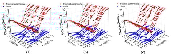 Uniaxial compressive strength and shear strength at different positions in the track bed: (a) surface; (b) middle; (c) bottom.