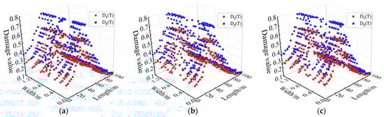 Damage value at different positions in the track bed: (a) surface; (b) middle; (c) bottom.