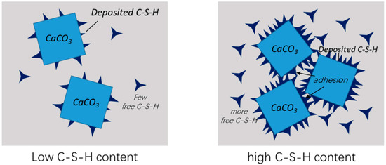 The mean size and free C–S–H content of CC–CSH samples are shown in Table 4. As the results suggest, for CC–CSH with a relatively low degree of C–S–H modification, most C–S–H was fixed on CaCO3 particles, and only few existed as nanogels. For CC–CSH-20, most C–S–H was in free form, which is due to the depletion of available CaCO3 surfaces. Taking out free C–S–H, the actual modification degrees of CC–CSH-10 and CC–CSH-20 were 7.73% and 9.38%, respectively. As shown in Table 4, the size of free nano C–S–H was much smaller than the CaCO3 particles, so the size of CC–CSH with 5% C–S–H modification was nearly the same as unmodified CaCO3. However, CC–CSH-10 and CC–CSH-20 were notably larger, which can be attributed to the adhesion effect of C–S–H [31] (as Figure 1 shows). The effect became more prominent with higher C–S–H contents, resulting in the agglomeration of a larger fraction of CC–CSH.