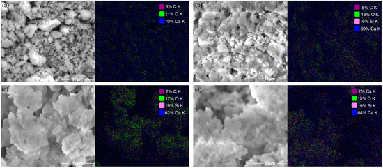 SEM-EDS images of the samples: (a) CaCO3; (b) CC–CSH-5; (c) CC–CSH-10; (d) CC–CSH-20. The magnification is 10,000× and the scale in the images is 10 μm.