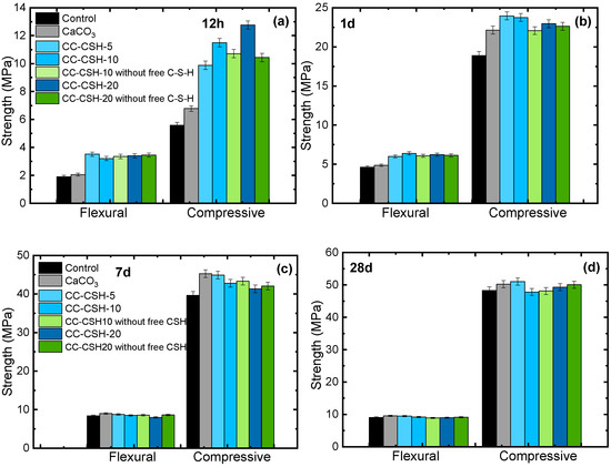 As for flexural strength, mortars with CaCO3 and CC–CSH admix at 12 h and 1 d experienced similar enhancing effects as compressive strength. However, 7 d mortars with CC–CSH-20 addition showed slightly inferior flexural strength than controls, indicating a more brittle nature of these mortars. This brittleness may also be caused by excessively fast hydration production formation in these samples [33], which is caused by the high C–S–H content of the two types of CC–CSH.