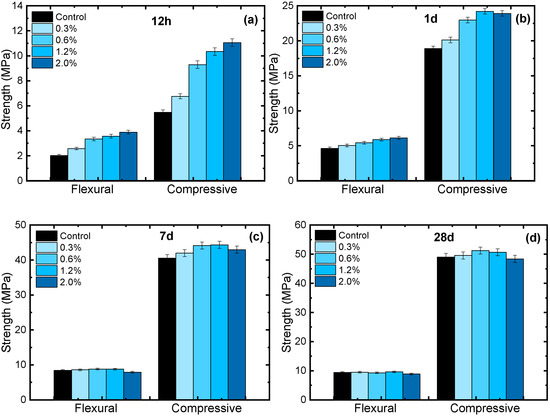 The dosage dependence of CC–CSH-5 was then tested to determine the optimal range, with the results demonstrated in Figure 4. As can be seen, at 12 h, the strength also showed a positive correlation with dosage, but in later ages, the strength enhancement in mortars with the highest dosage (2.0%) soon weakened, just like the CC–CSH with high C–S–H contents. Mortar with 2.0% CC–CSH dosage also exhibited brittleness, with flexural strength slightly dropping. The overall performances of 0.6% and 1.2% CC–CSH dosage were the most satisfactory, indicating an optimal range roughly between 0.6% and 1.2%. The strength of CC–CSH-5-modified mortars showed the typical dosage dependence of nanomaterials [7,34], where the effectiveness was impeded at high dosages.