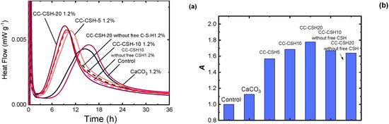 To quantitatively evaluate the acceleration effect of CC–CSH, an acceleration coefficient A was calculated using the following equation based on the method of Luc Nicoleau and co-workers [35,36]: