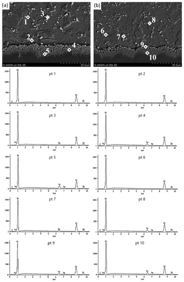 The EDS X-ray spectral analysis in coating micro-areas on the cross-section of the galvanized variant wire (a) K5 and (b) H5.