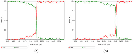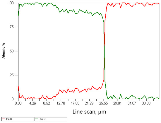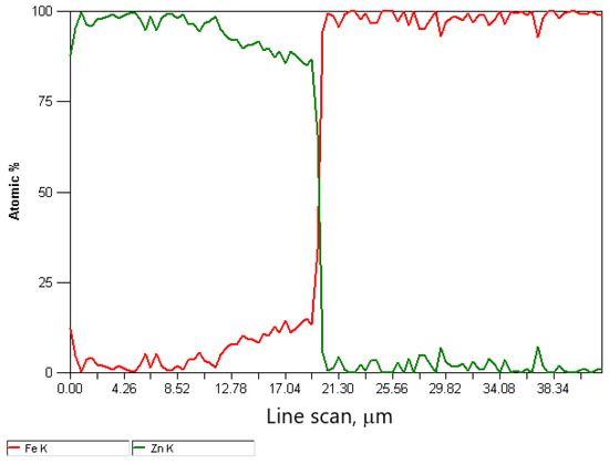 The chemical analysis of the micro-areas in points 4 and 10 (Figure 4b and Figure 5b) showed that the iron content of the above-mentioned points is 6.0% and 6.4% by weight, respectively, which confirms the presence of a residual phase ζ. Under the Fe–Zn phase equilibrium system, the ζ phase is not stable at temperatures exceeding 520 °C [22]. This proves that the wire drawn with the hydrodynamic method is lower in temperature. The ζ phase boundary was deformed as a result of the plastic working, which leads to the lack of its differentiation, and a small amount is the result of its reconstruction into phase δ1. During high-speed plastic processing, this phase develops (Figure 4b and Figure 5b), which is confirmed by the micro-areas in points 5 and 9 containing 8.0% and 10.8% by weight, respectively, which corresponds to the stability of phase δ1.