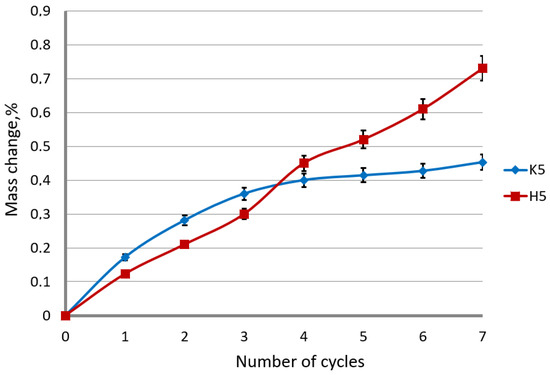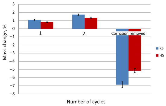 The percentage change in mass of the galvanized wire samples drawn at a speed of 5 m/s using the conventional K5 method and the hydrodynamic H5 method, made in a salt spray chamber, where the exposure took place in cycles.