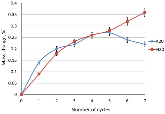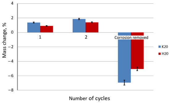 The percentage change in mass of the galvanized wire samples drawn at a speed of 20 m/s using the conventional K20 method and the hydrodynamic H20 method, made in a salt spray chamber, where the exposure took place in cycles.
