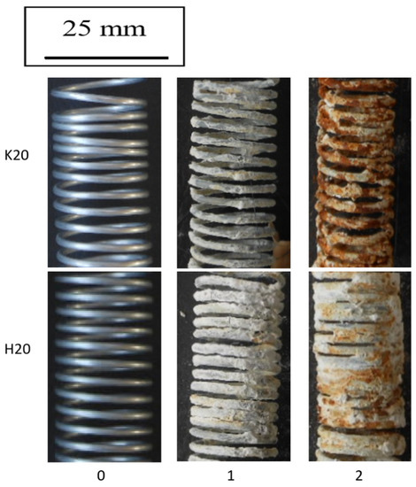 The tests were supplemented by corrosion tests in sprayed brine carried out in a Kesternich chamber in accordance with the EN ISO 9227 standard (tests were conducted at 35 °C, the concentration of atomized sodium chloride in distilled water was 5%). Similarly, as in the case of corrosion tests in an atmosphere with sulfur dioxide, samples of springs made of the galvanized wire were used for corrosion tests in a salt chamber. After each of the cycles, the surface of the zinc coatings was analyzed, and the mass of the samples was measured (one cycle is 24 h of wire/spring in a salt spray chamber).