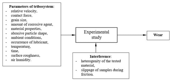 After a detailed analysis of the issue of wear of friction node and an assessment of the relevance of the input function (mechanical, abrasive, and corrosive), an experimental study was planned taking into account the input factors, constants, and interferences that may occur during the implementation of the study (Figure 1). The study included four input factors, which varied at four levels as follows: