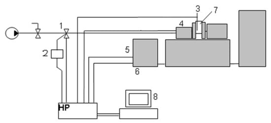 Control and measurement diagram of the UMT-2168 friction machine: 1—pneumatic valve supplying the load setting actuator; 2—pressure transducer; 3—thermocouple; 4—friction torque transducer; 5—drive system; 6—tachometer generator; 7—test chamber; 8—control panel.